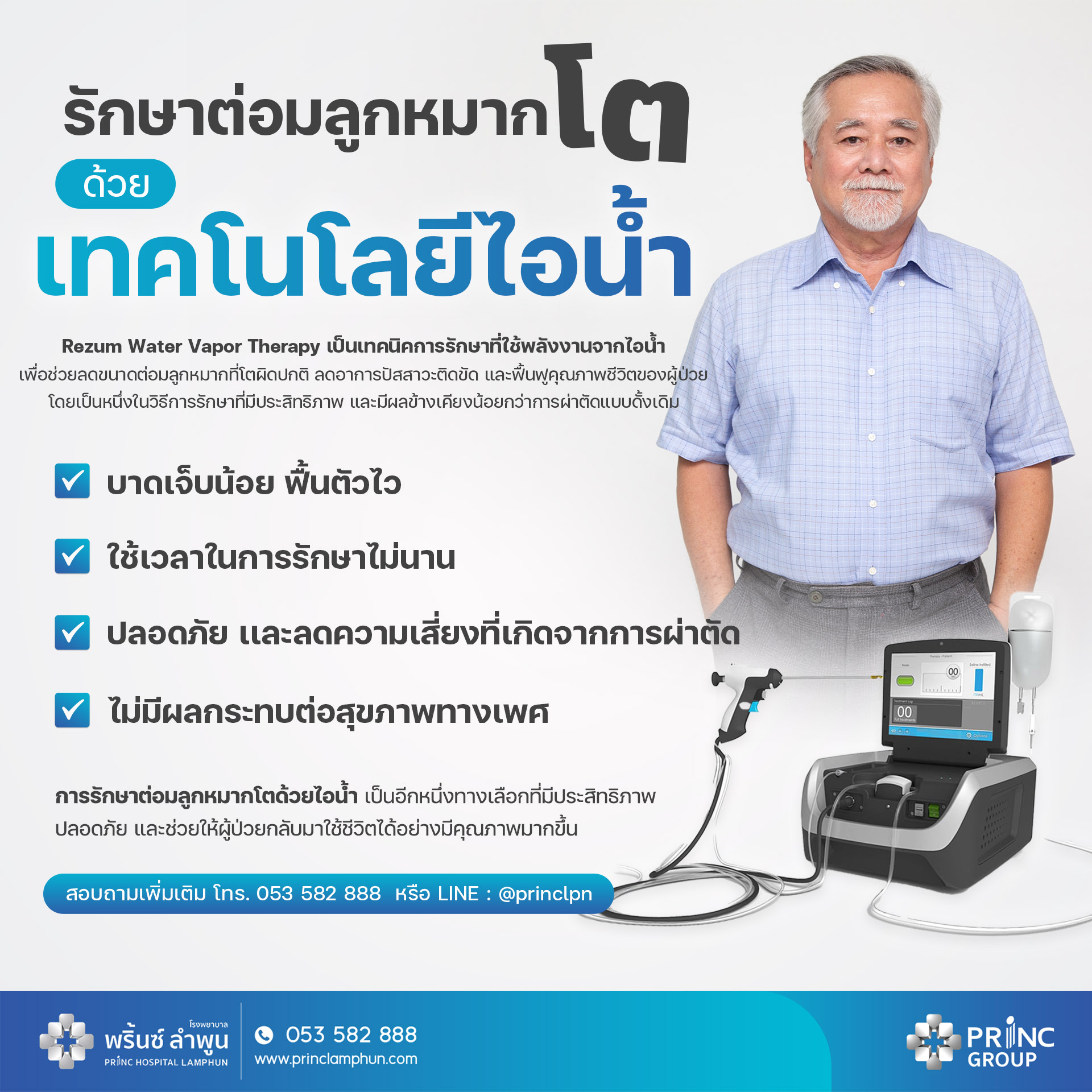 โรงพยาบาลพริ้นซ์ ลำพูน พร้อมให้บริการรักษาภาวะต่อมลูกหมากโตด้วยเทคโนโลยี Rezum Water Vapor Therapy โดยทีมแพทย์เฉพาะทางระบบทางเดินปัสสาวะ (Urologist) พร้อมเครื่องมือมาตรฐานสากล และการดูแลอย่างใกล้ชิดตั้งแต่ก่อนจนถึงหลังการรักษา เพื่อให้ผู้ป่วยกลับมามีคุณภาพชีวิตที่ดีอีกครั้ง