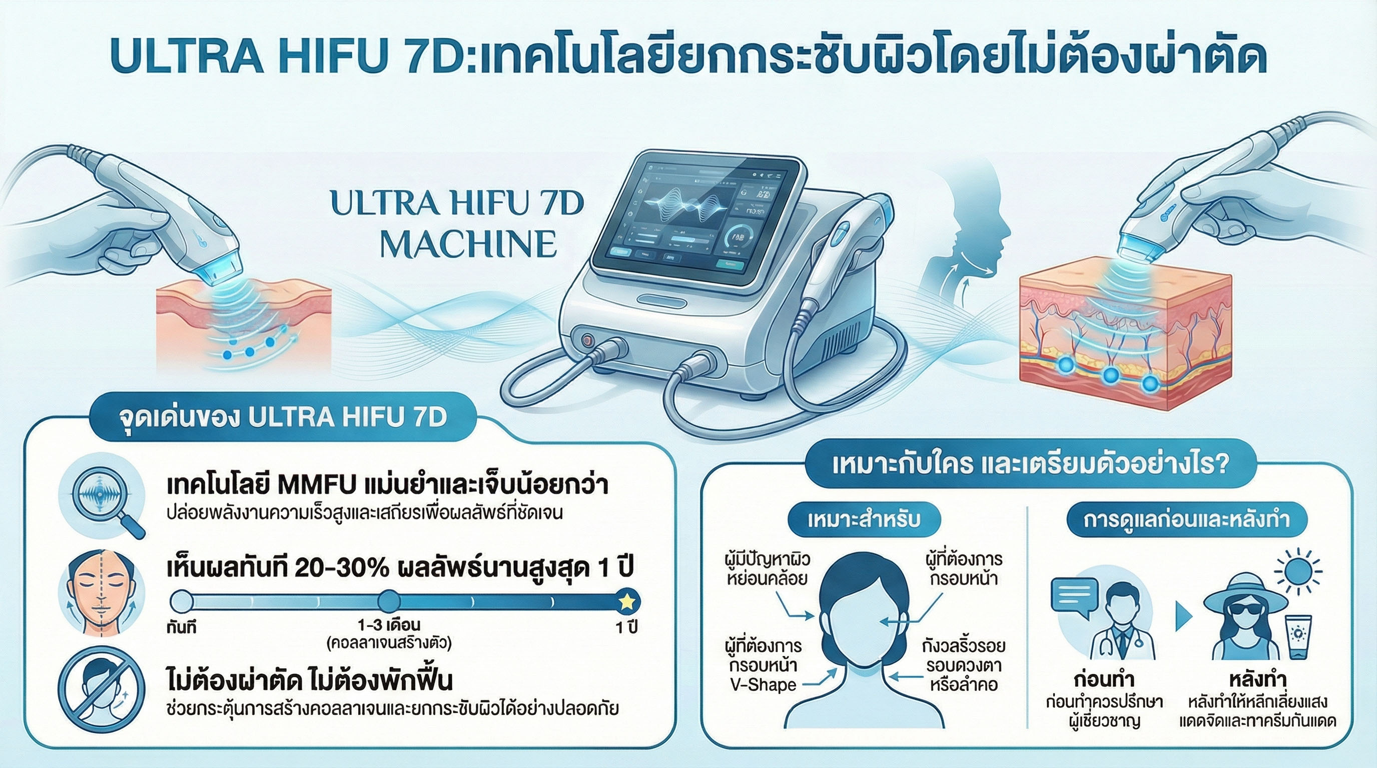 ในปัจจุบัน การดูแลผิวให้ดูอ่อนเยาว์และตึงกระชับทำได้ง่ายกว่าที่เคยด้วยเทคโนโลยี Ultra HIFU 7D ทางเลือกใหม่ที่มีประสิทธิภาพสูงสำหรับการยกกระชับผิวหน้าและลำคอ โดยไม่ต้องอาศัยการผ่าตัดศัลยกรรม นวัตกรรมนี้ได้รับการออกแบบมาเพื่อตอบโจทย์ผู้ที่ต้องการผลลัพธ์ที่เป็นธรรมชาติและความปลอดภัยสูงสุด