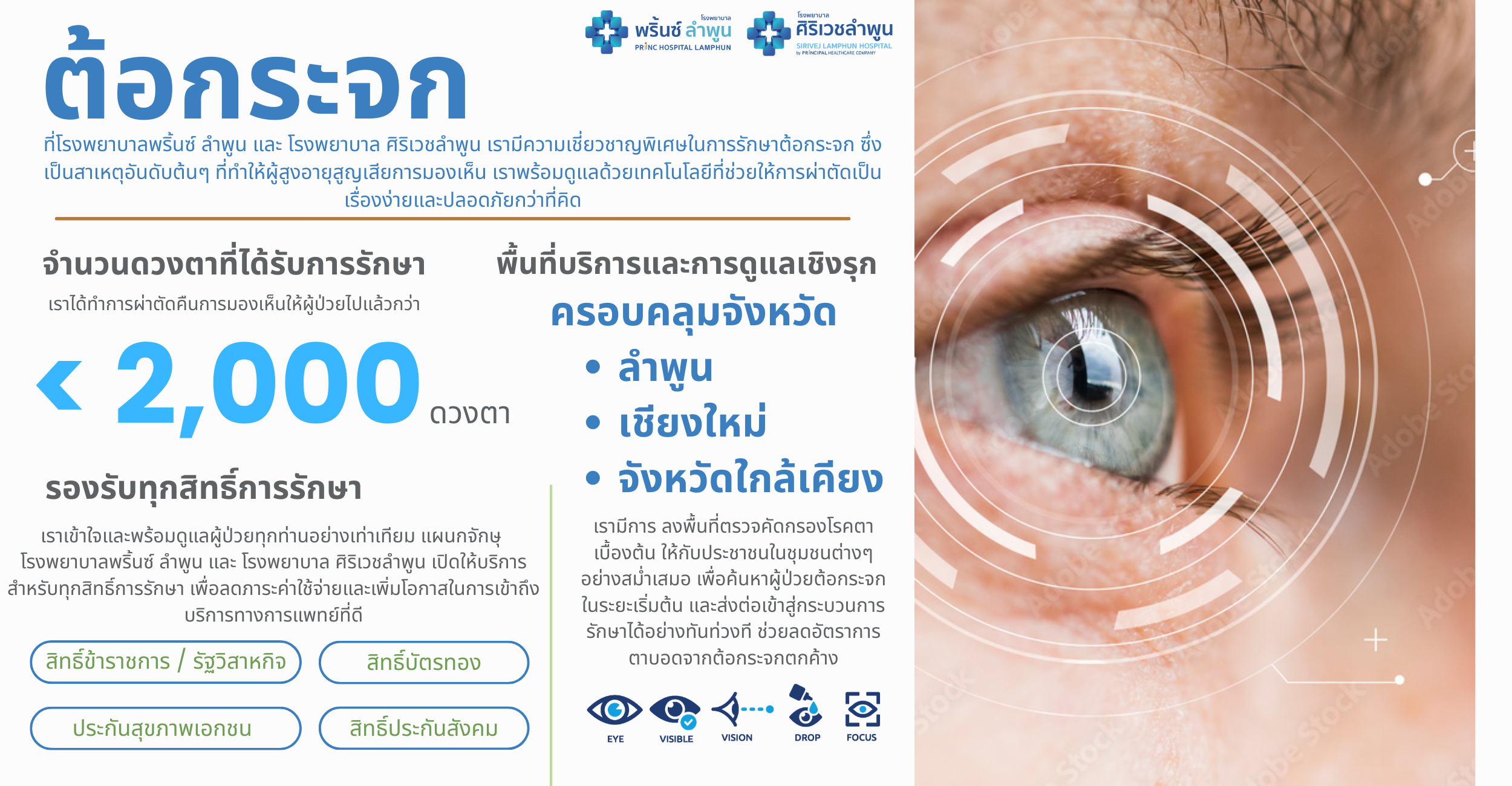 แลสุขภาพดวงตาด้วยความเชี่ยวชาญและการันตีความสำเร็จจากการผ่าตัดคืนการมองเห็นมาแล้วกว่า 1,500 ดวงตา โดยให้บริการครอบคลุมพื้นที่ทั้งในจังหวัดลำพูน เชียงใหม่ และจังหวัดใกล้เคียง รวมถึงการออกหน่วยแพทย์เคลื่อนที่เพื่อตรวจคัดกรองเชิงรุกในชุมชน อีกทั้งยังเปิดกว้างให้ผู้ป่วยทุกสิทธิ์การรักษา ไม่ว่าจะเป็นข้าราชการ บัตรทอง ประกันสังคม หรือประกันสุขภาพเอกชน สามารถเข้าถึงบริการที่มีคุณภาพได้อย่างเท่าเทียม
