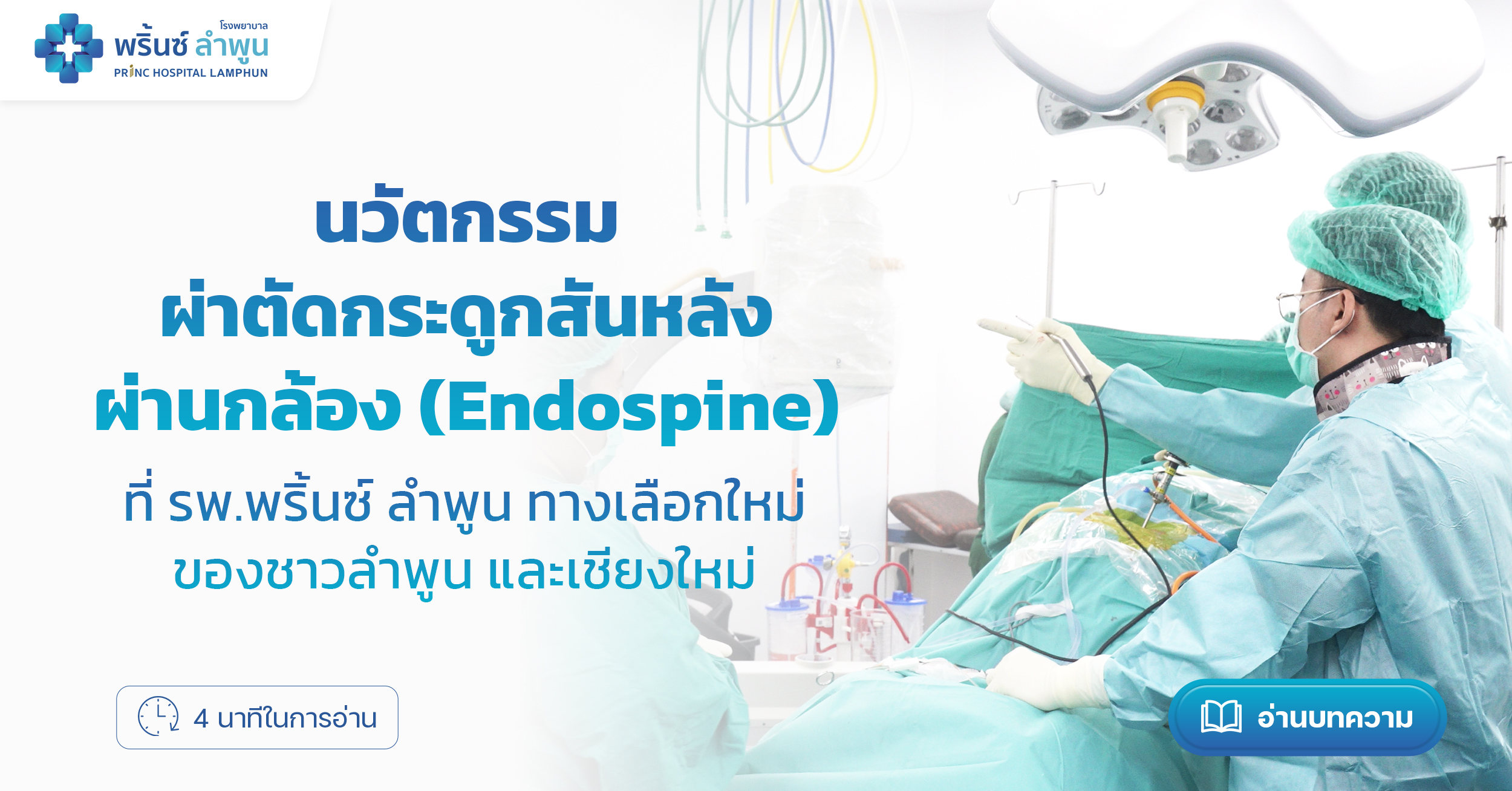 วันนี้ โรงพยาบาลพริ้นซ์ ลำพูน ขอนำเสนอนวัตกรรมการรักษาที่ล้ำสมัย "การผ่าตัดกระดูกสันหลังผ่านกล้อง Endospine" (Endoscopic Spine Surgery) เทคโนโลยีการผ่าตัดแผลเล็กที่ช่วยให้คุณกลับไปใช้ชีวิตปกติได้เร็วยิ่งขึ้น พร้อมให้บริการแล้วสำหรับชาวลำพูน เชียงใหม่ และจังหวัดใกล้เคียง
