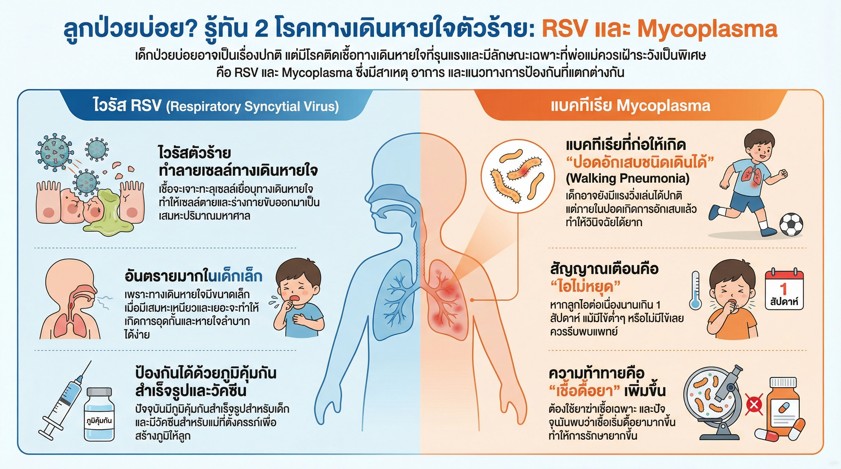 ข้อแนะนำทิ้งท้าย: หากบุตรหลานมีอาการไอเรื้อรัง หายใจหอบเหนื่อย หรือมีไข้สูงติดต่อกันนาน ควรรรีบพาไปพบแพทย์เพื่อตรวจวินิจฉัยแยกโรคให้ชัดเจนว่าเป็น RSV, Mycoplasma หรือไข้หวัดใหญ่ เพื่อการรักษาที่ตรงจุดครับ